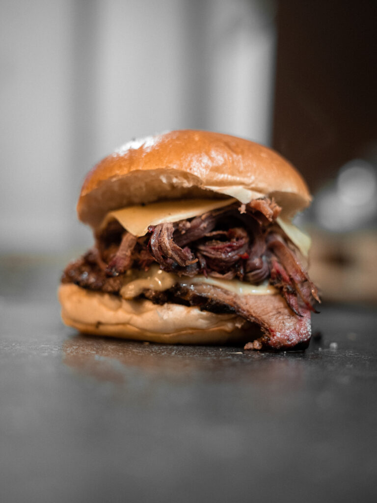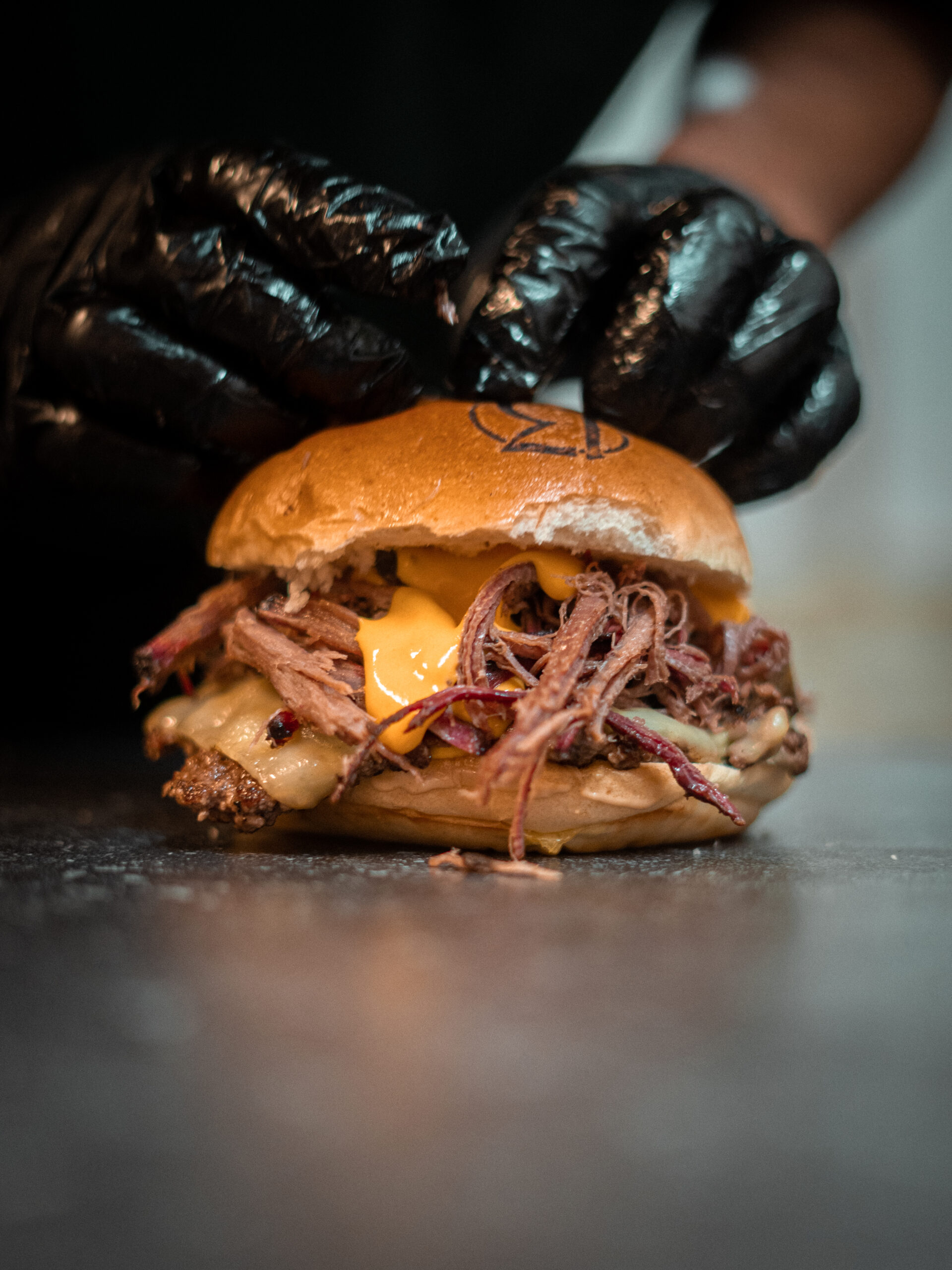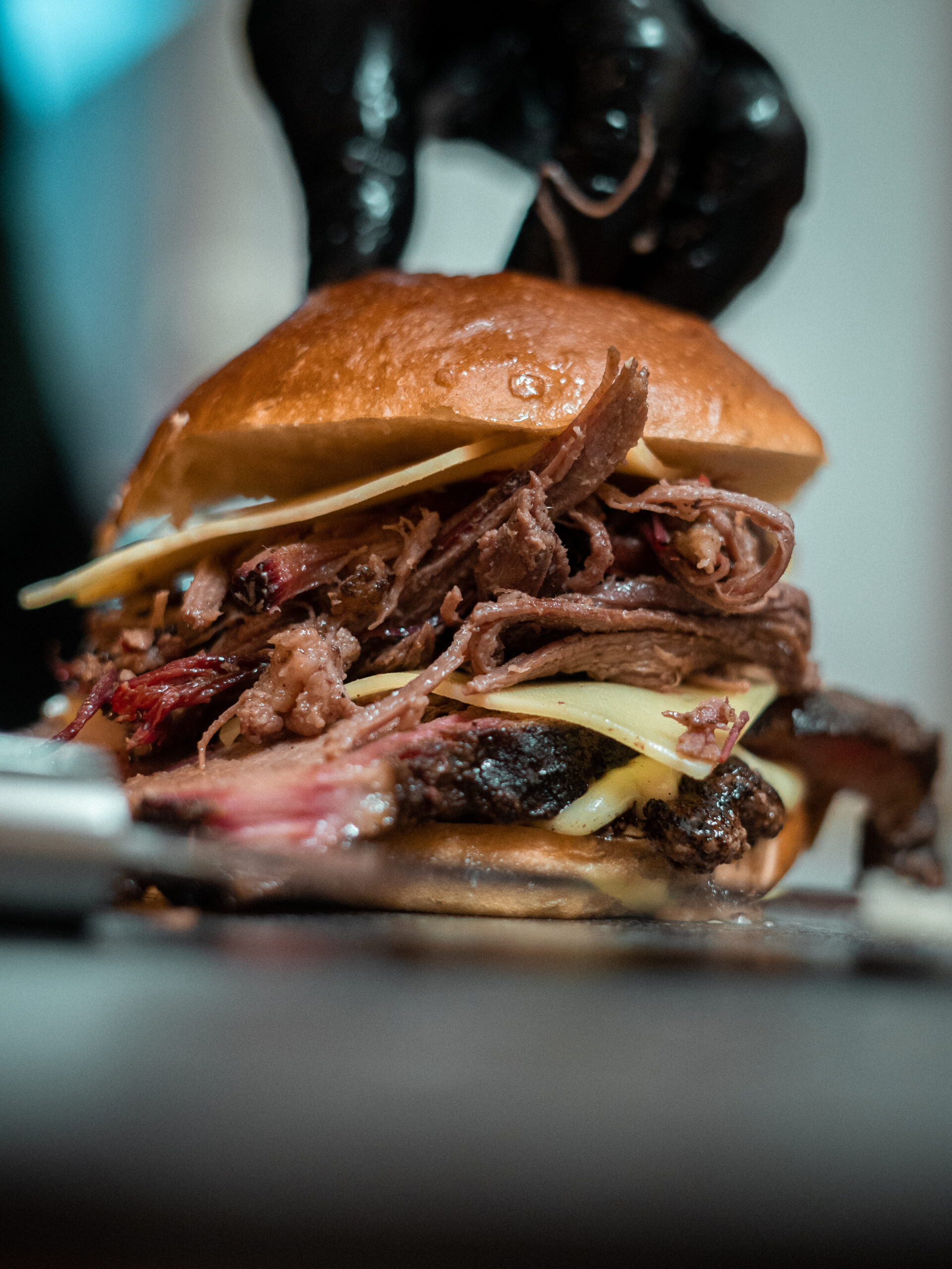 Angus burger + cheese, smoked angus brisket, pulled, cheese sauce, babaganoush, homemade barabeque sauce, pickles