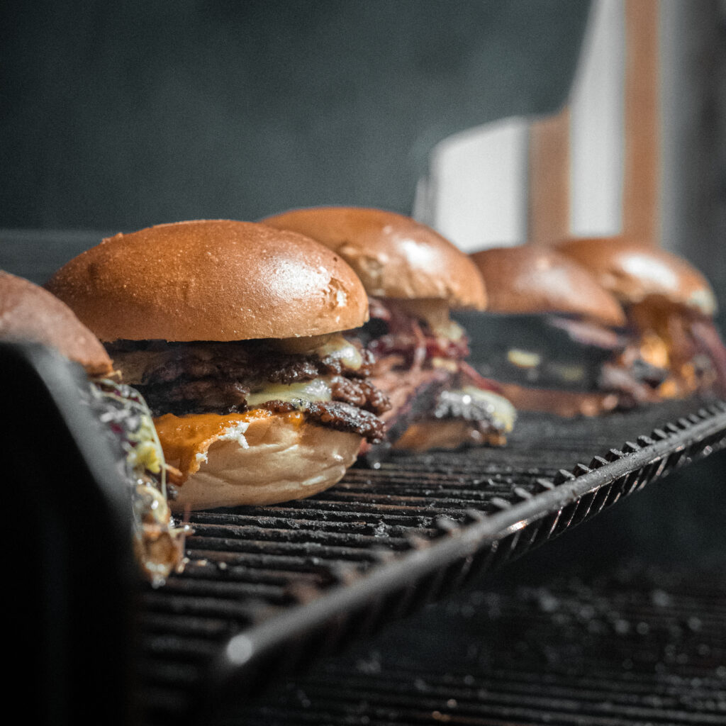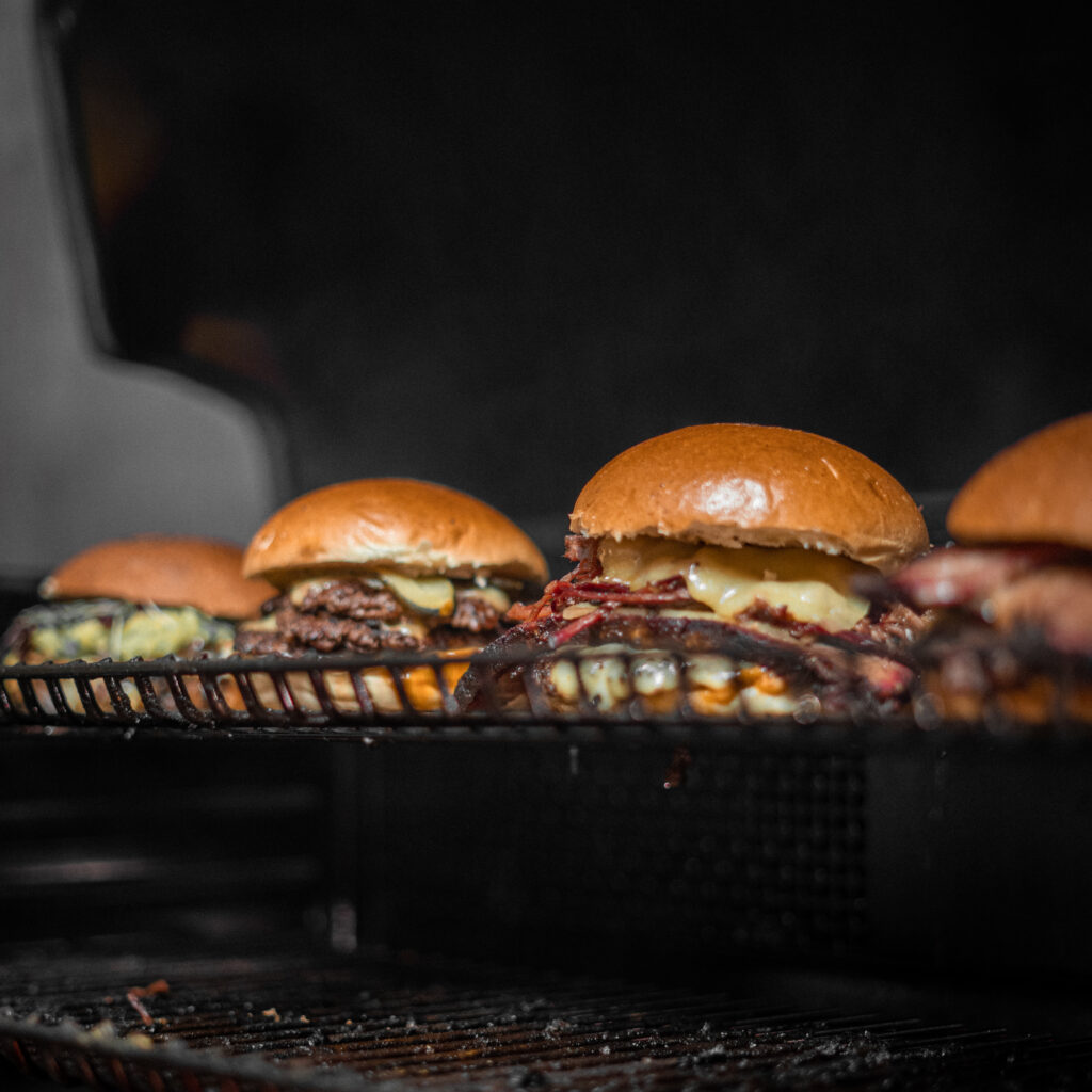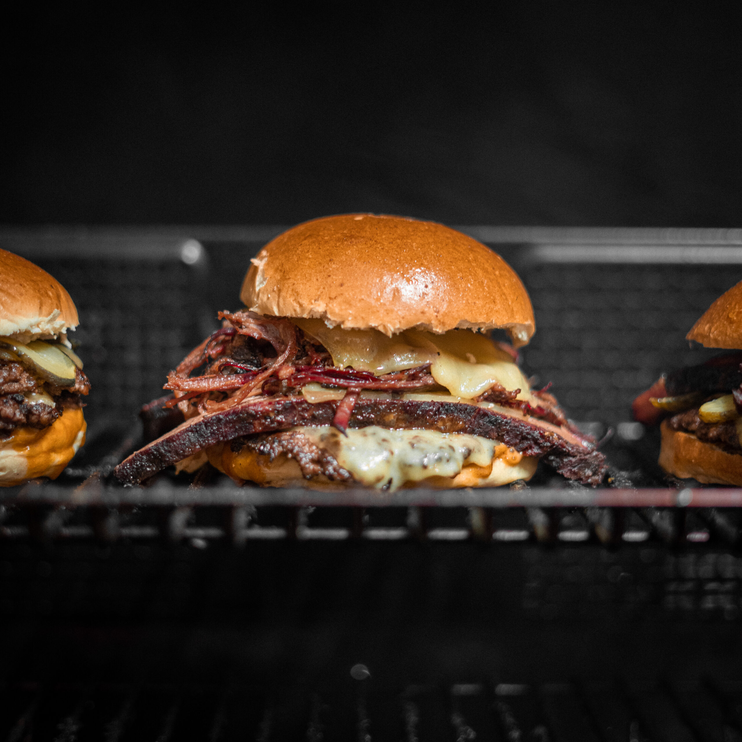 Angus burger + cheese, smoked angus brisket, slices + cheese, smoked angus brisket, pulled + cheese, smash sauce, pickles
